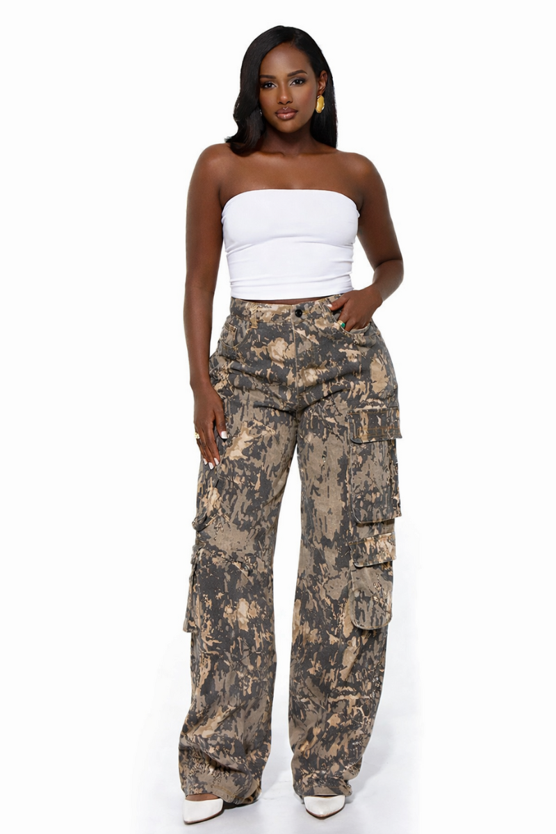 Command attention in these statement-making wide leg cargo pants featuring an abstract camouflage print in earthy tones of charcoal, taupe, and cream. Designed for the modern utility-chic aesthetic, these pants are loaded with multiple oversized flap pockets down both legs, offering both style and function. The high-rise waist creates a flattering silhouette while the dramatic wide leg cut elongates your frame. Style them with a fitted crop top and sneakers for street-style cool, or dress them up with heels and a sleek bodysuit for fashion-forward edge. Perfect for festival season, casual weekends, or anytime you want to bring military-inspired style with a feminine twist.