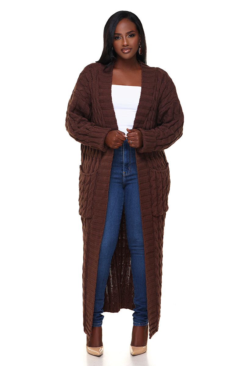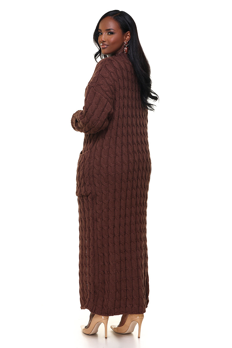 Wrap yourself in comfort with this floor-length brown cable knit cardigan. The rich chocolate hue and chunky cable knit pattern create cozy sophistication, while the long silhouette adds drama and warmth. An essential layering style for chilly days.