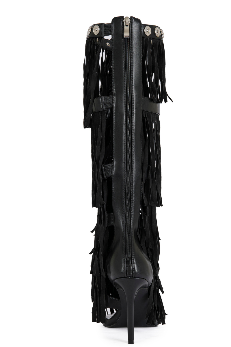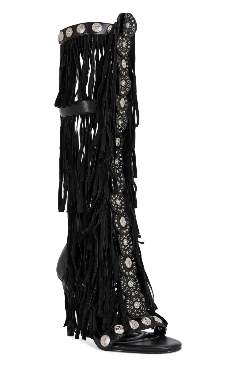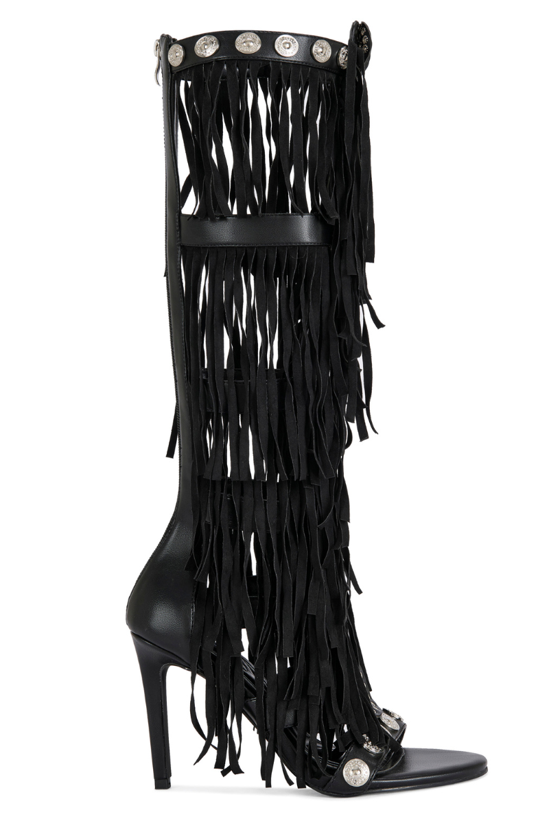 Designed to command attention with every step, this knee-high heel features cascading fringe that moves effortlessly with your stride, creating instant drama and undeniable presence. Crafted in sleek black with silver stud detailing throughout, this silhouette blends western edge with high-fashion attitude.