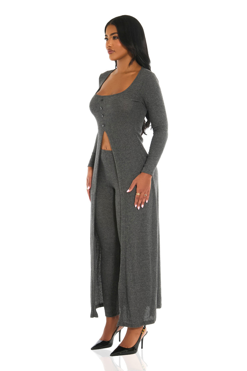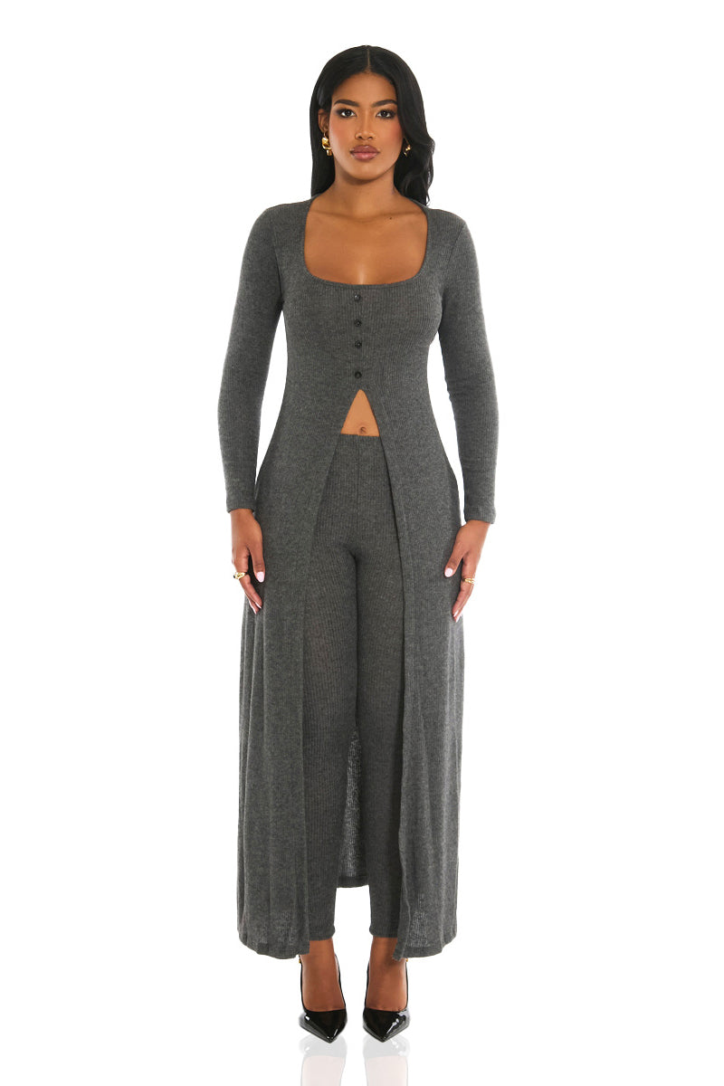 Where ease meets intention. The Muse Knit Set is crafted in a soft, ribbed knit that drapes effortlessly over the body, featuring a fitted square neckline, button-front detailing, and a fluid split hem that reveals the matching high-waist pant beneath. Style it for a dinner in the city or a weekend escape; either way, it’s made to be remembered.