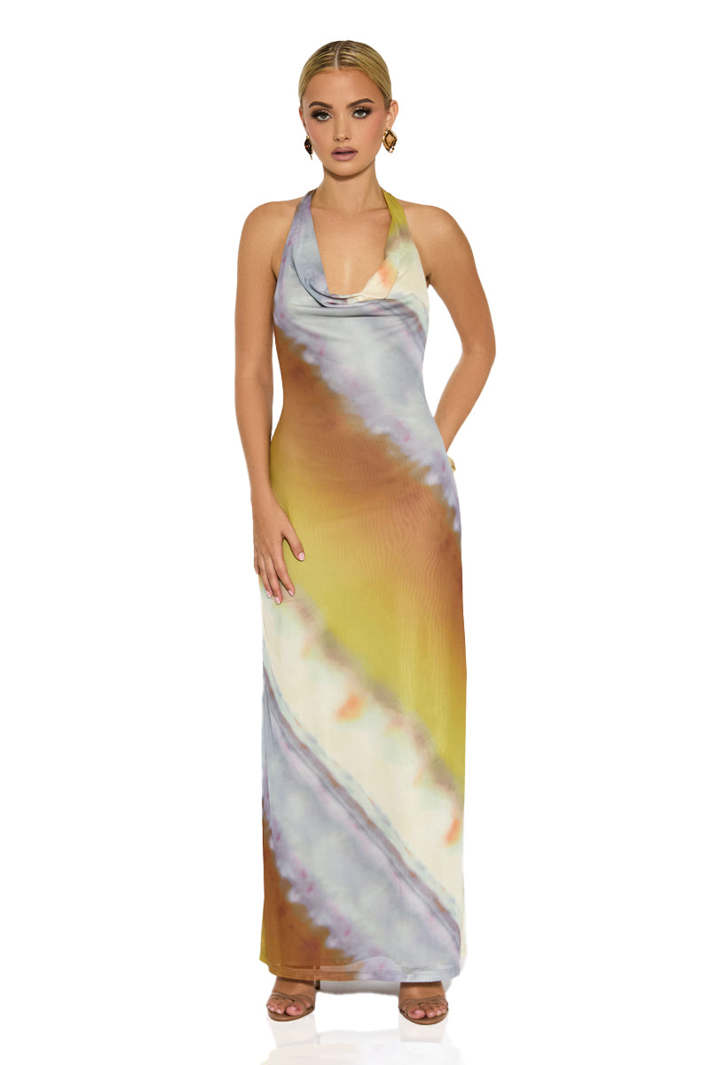 A vision of effortless allure, this gown drapes the body in fluid elegance. The cowl neckline softens the silhouette, while the open halter back adds a touch of sensuality. Designed in a watercolor-inspired print that flows seamlessly across the fabric, it captures movement and light with every step. Perfect for warm evenings, destination getaways, or any occasion that calls for quiet drama.