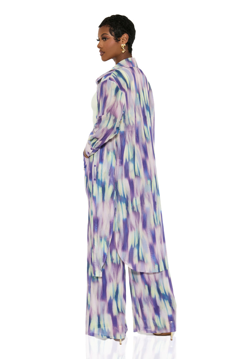 Light as air and made for movement, this printed set redefines effortless dressing. Crafted from a sheer mesh fabric, the relaxed button-down top layers seamlessly over the wide-leg pant for a look that’s both polished and playful. The pants feature an elastic waistband and side pockets for comfort and ease, making this set perfect for travel, resort escapes, or long summer nights.