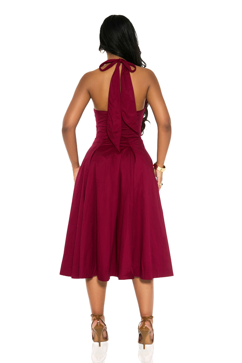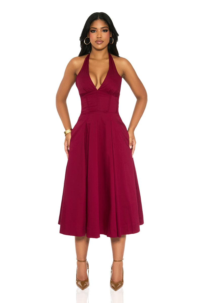 A modern take on timeless glamour, this halter midi is designed to flatter and flow. The structured bodice highlights the waist with soft pleating, while the plunging neckline adds allure. Finished with a full A-line skirt that moves effortlessly, it’s a dress that balances refinement with ease — equally suited for cocktail hours, weddings, or any evening that lingers long after sunset.